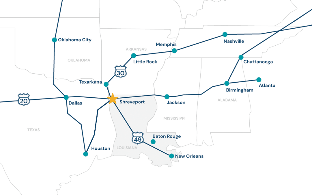 With two major interstates (I-20 and I-49) converging in greater Shreveport, businesses can easily access more than 40 million consumers in some of America’s largest markets, including Dallas and Houston, New Orleans and Baton Rouge, Little Rock and Oklahoma City. Six railroads and the Port of Caddo-Bossier also connect the region to the world.